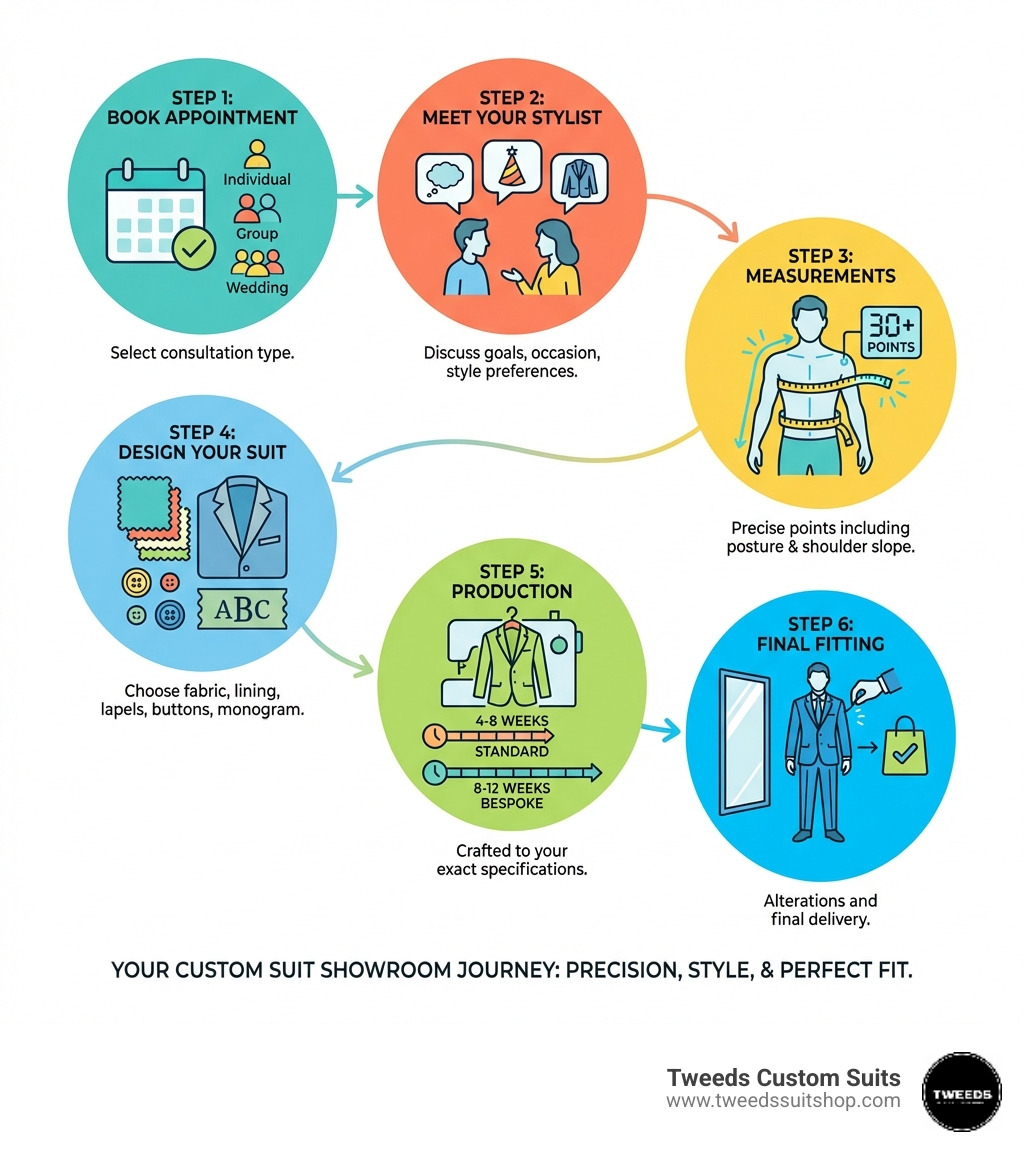 A custom suit showroom visit is how you go from frustrated by ill-fitting off-the-rack options to walking out with a suit built around your body, style, and occasion. Here's what the process looks like at a glance: