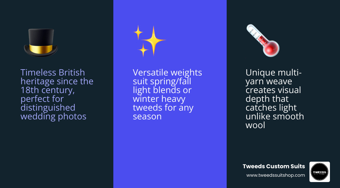 Tweed) has been a British wardrobe staple since the 18th century — originally crafted for durability in harsh Scottish weather, it has since become a symbol of refined, effortless style. Today, it's one of the most sought-after fabrics for wedding attire, especially for grooms who want to look sharp without looking generic.